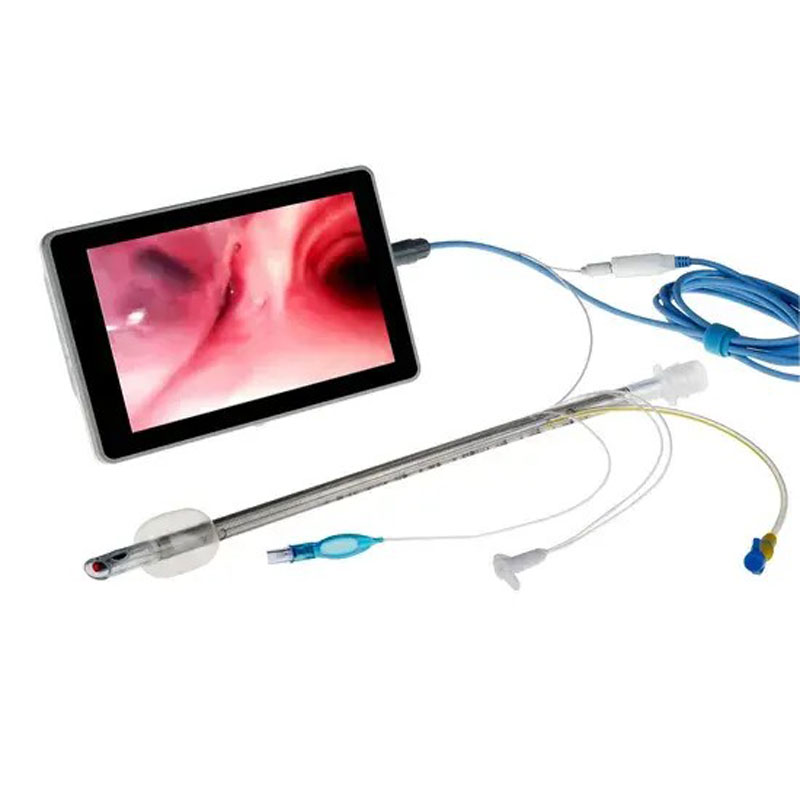 Tubo endotraqueal reforçado visualmente com porta de sucção acrescenta estilete iluminado. A câmera oferece visão clara das vias aéreas durante inserção e reduz a chance de extravio.